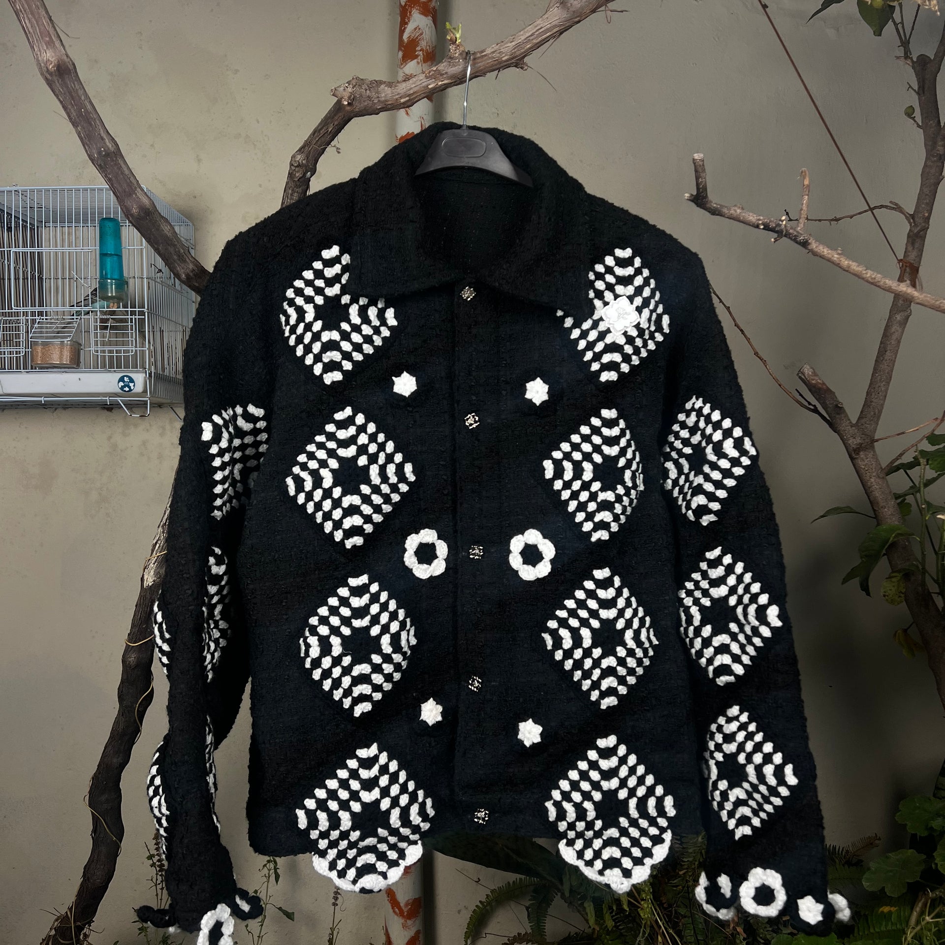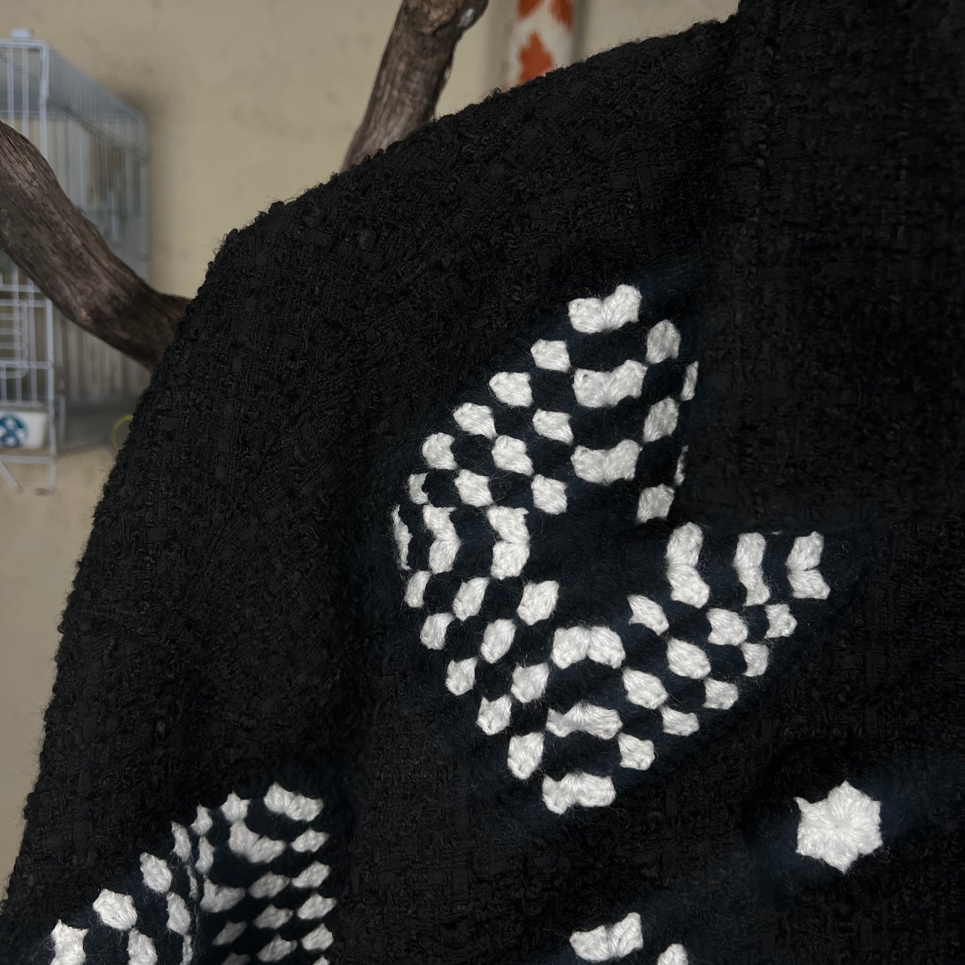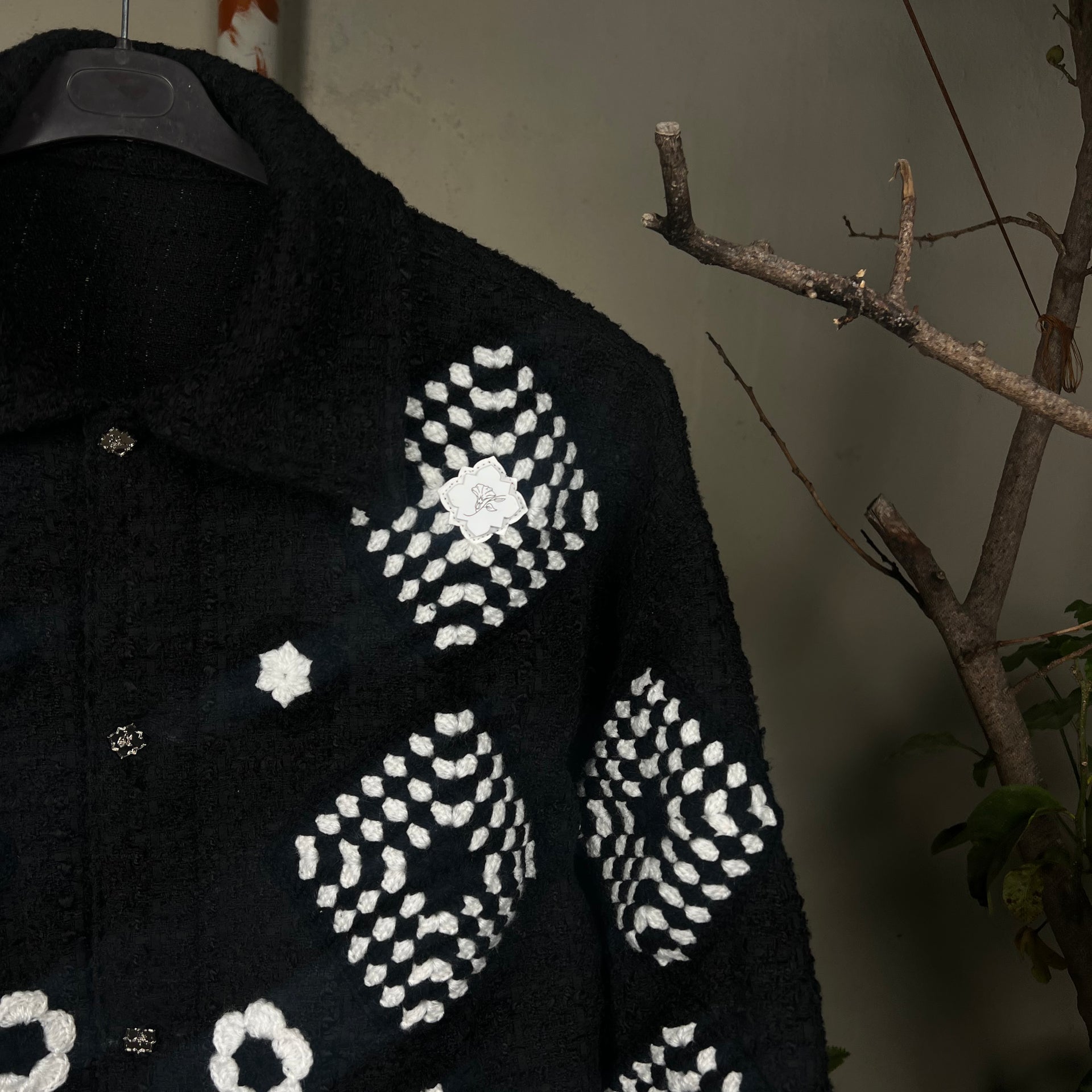 Handcrafted from luxurious black tweed and premium wool crochet, it carries the depth of texture and the soul of handmade creation.
