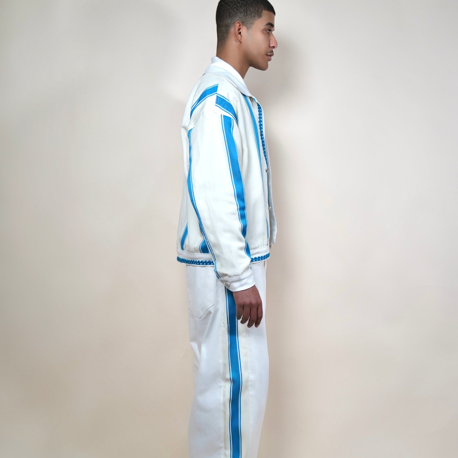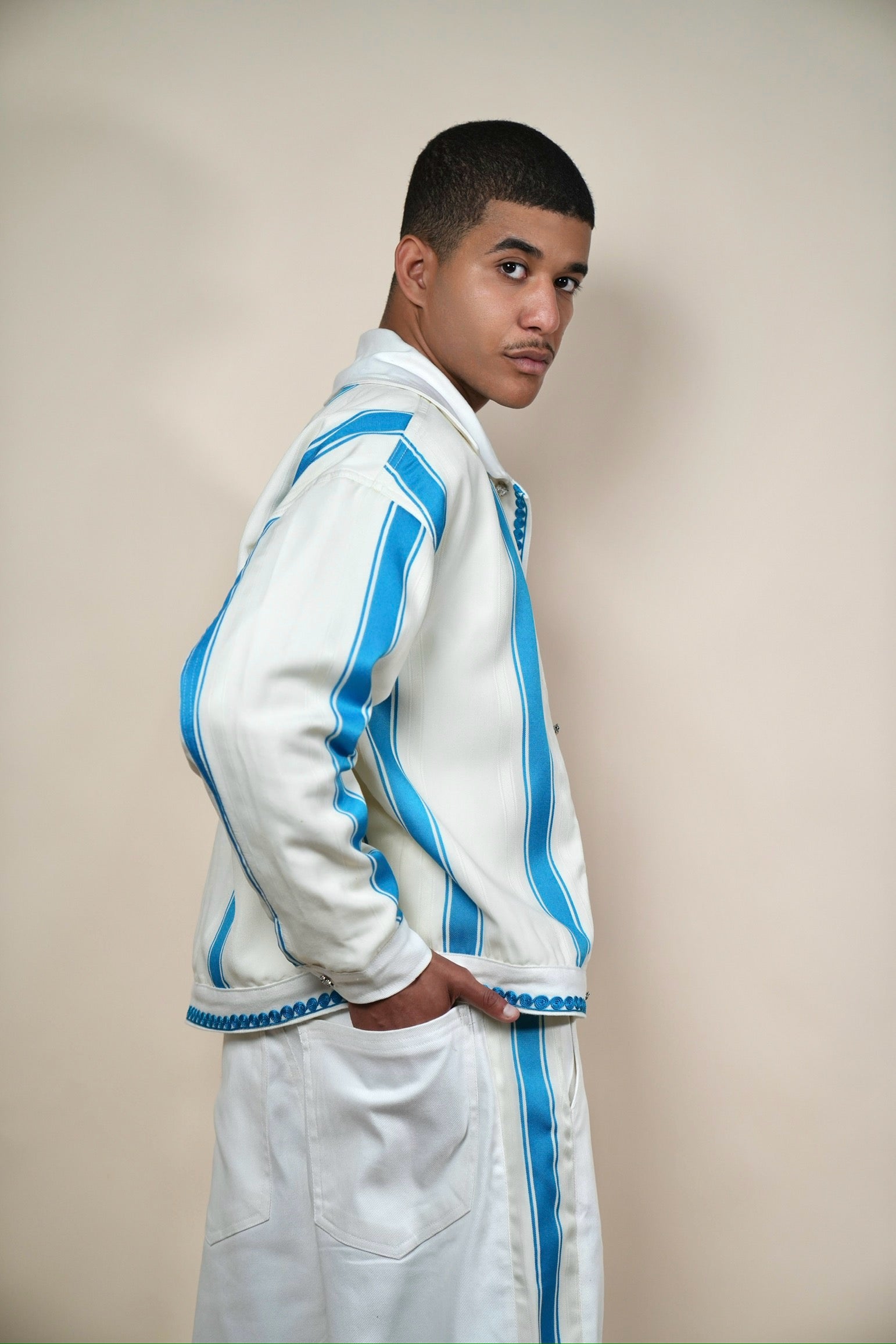 Details: Subtle embroidery, hand-finished seams, soft heritage pattern