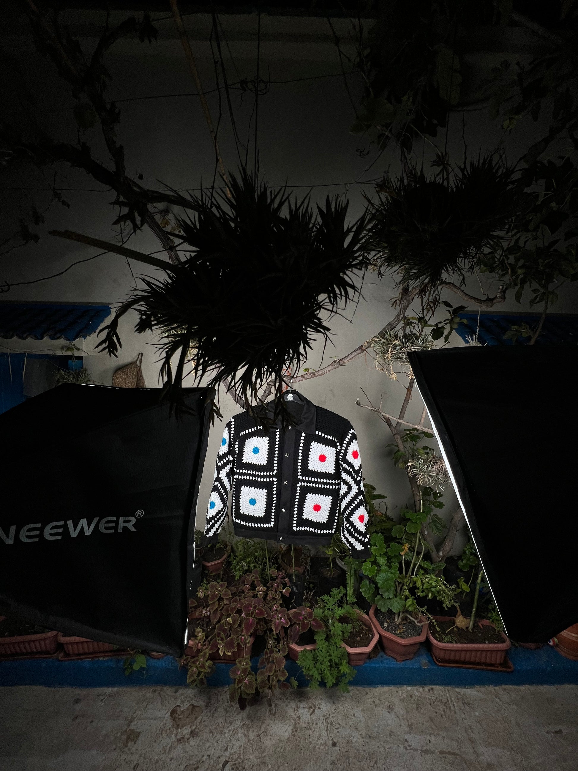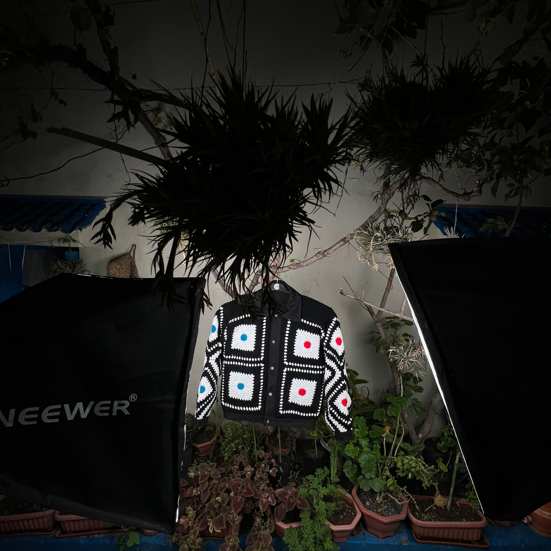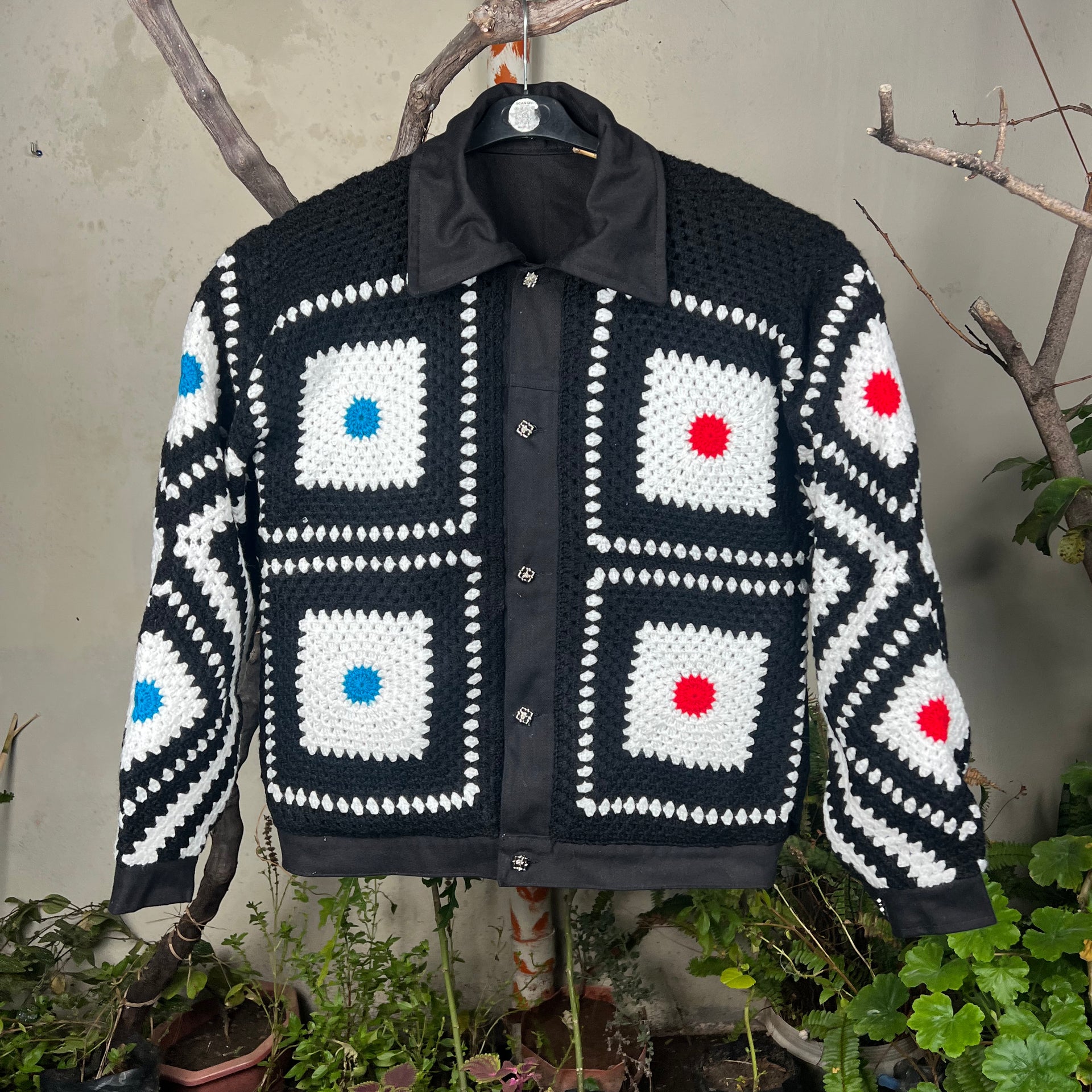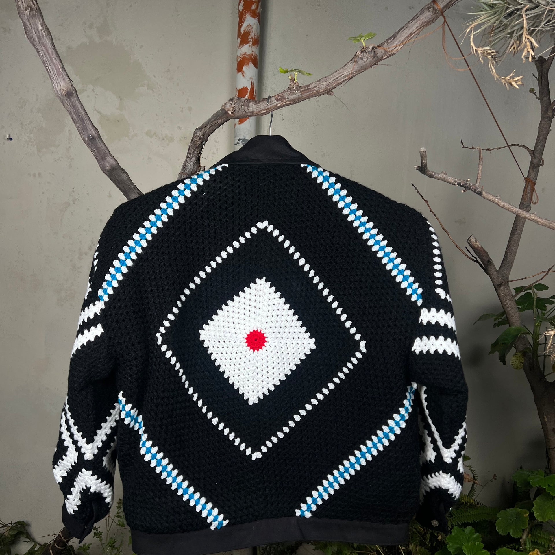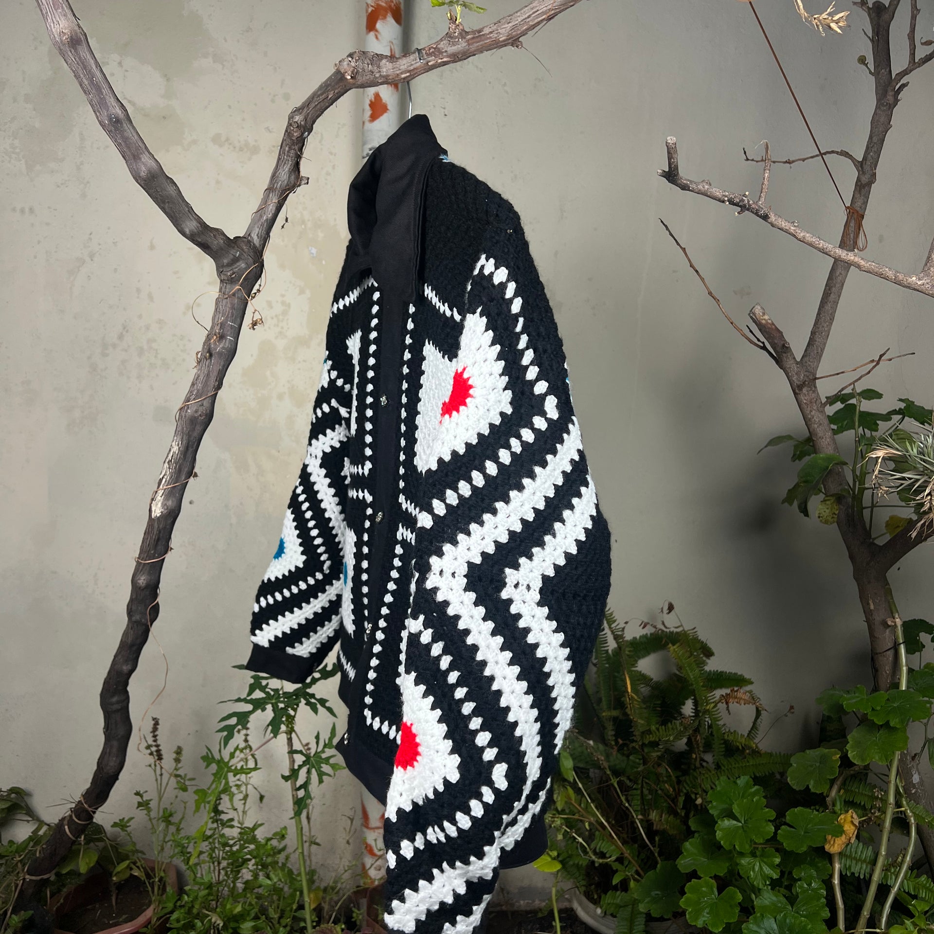 Handcrafted in Morocco from premium wool crochet, its palette of black, white, red, and blue embodies the energy of contrast: