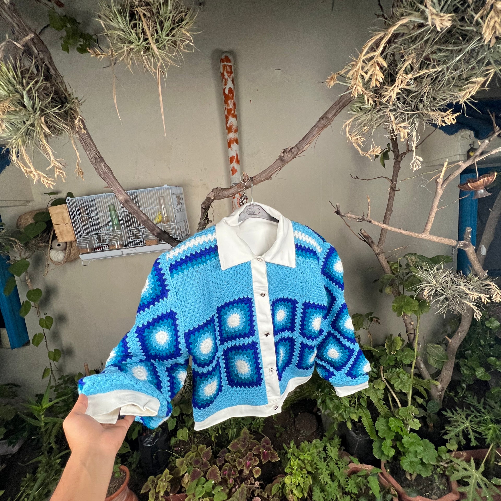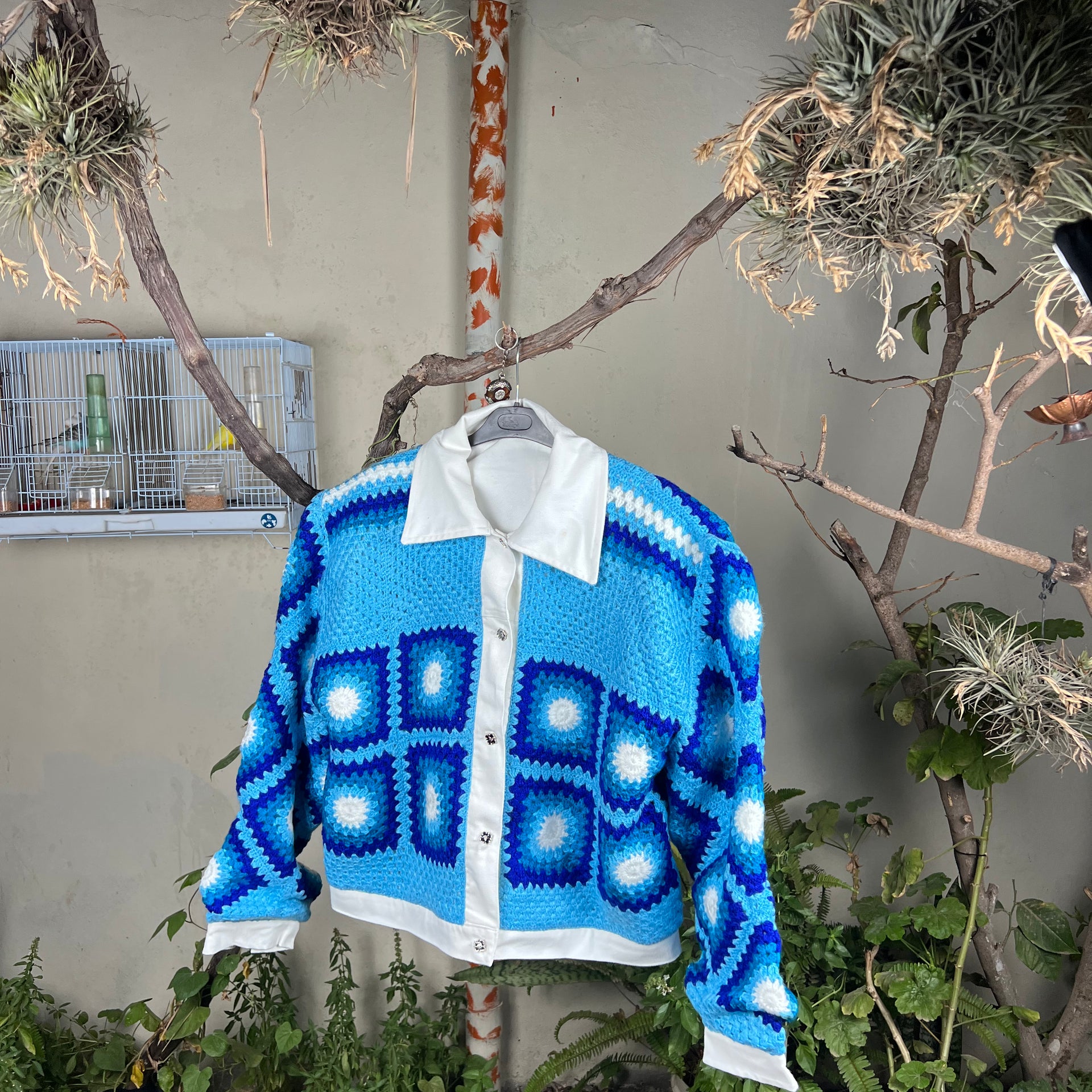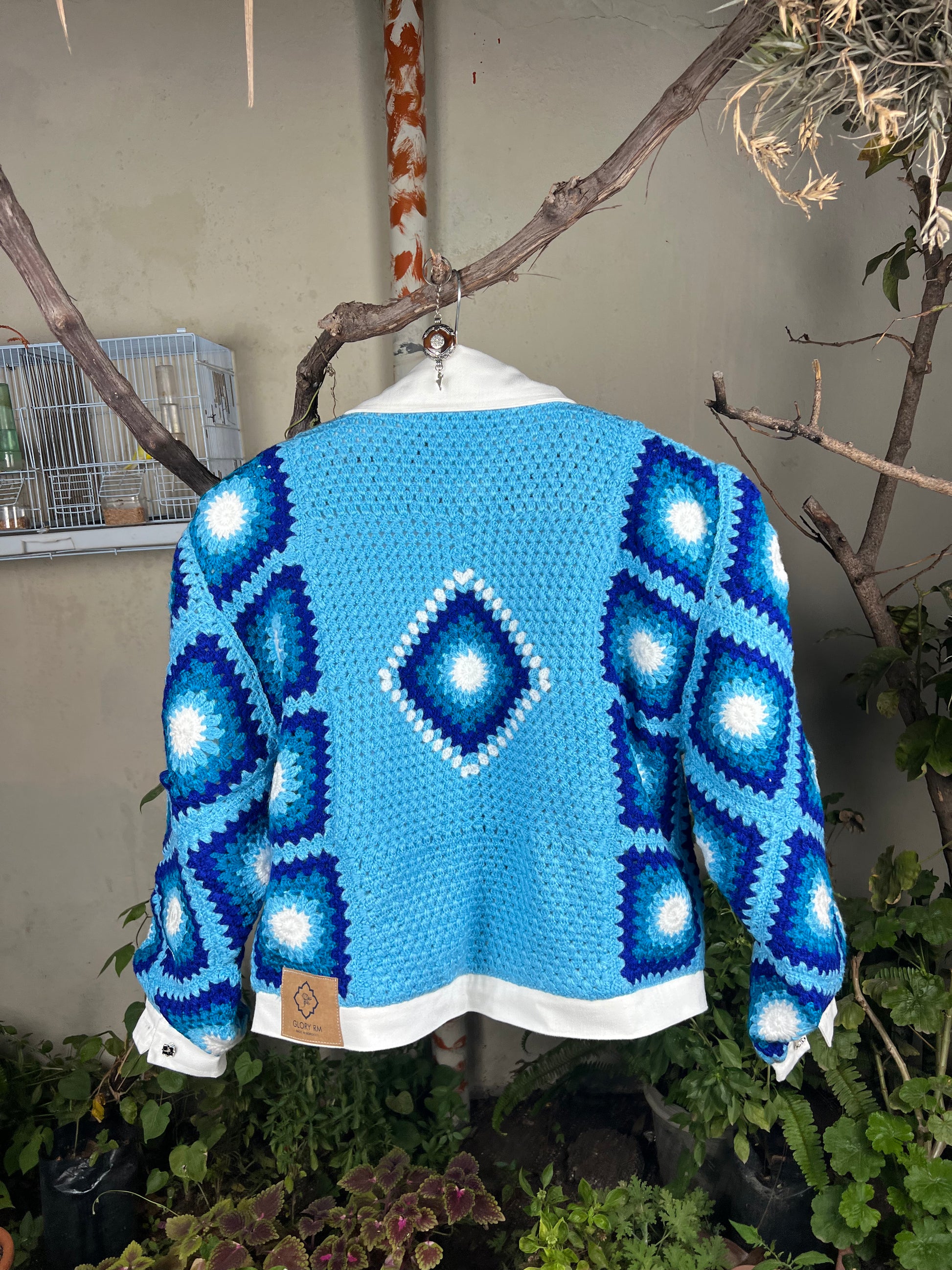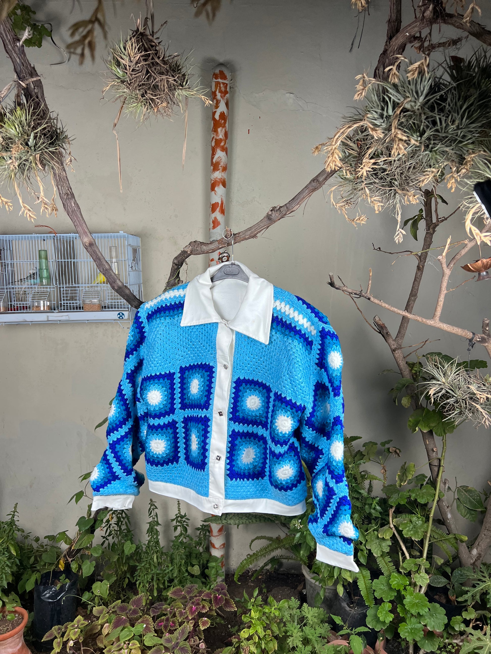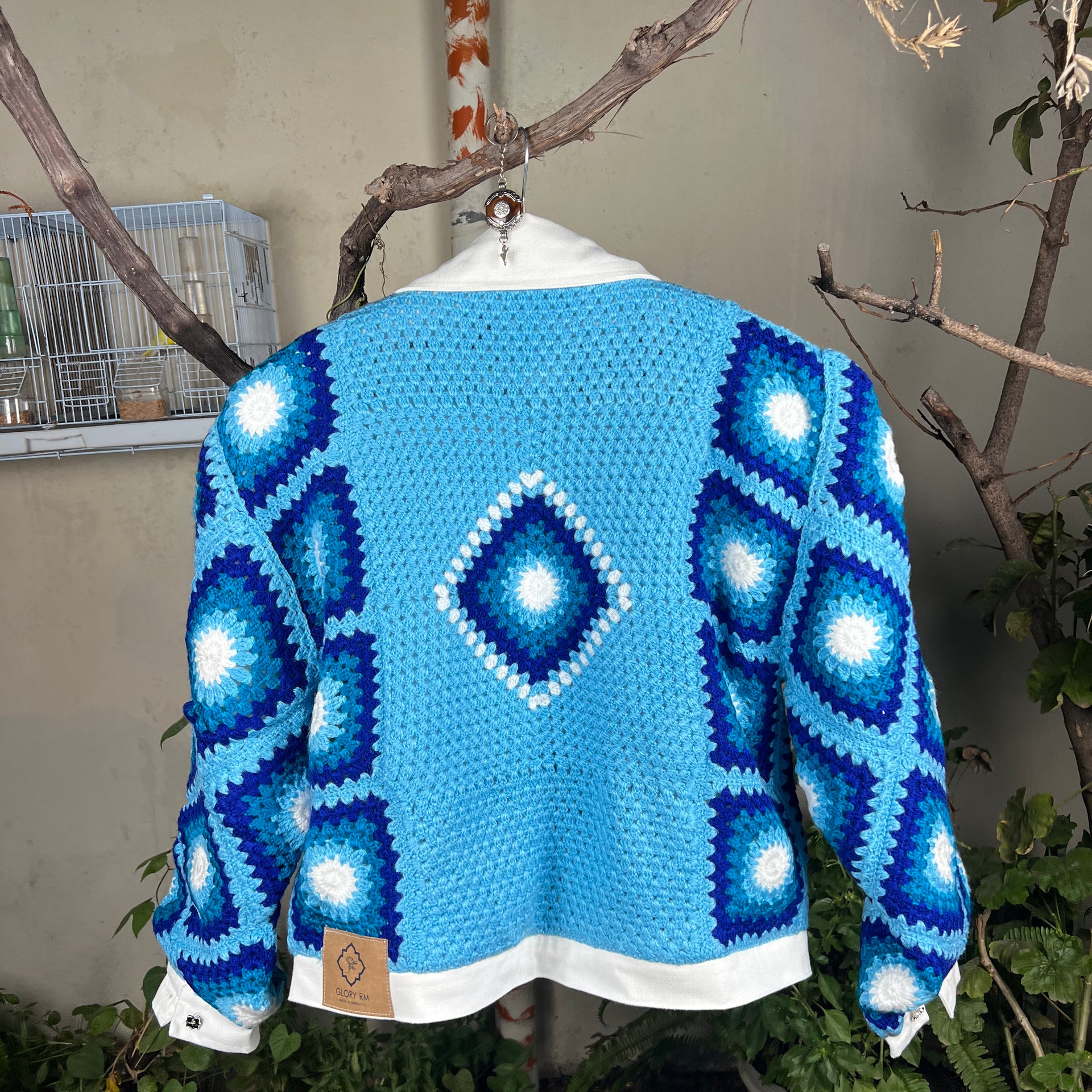 Confectionnée à la main 🪡 avec soin, cette veste oversize associe confort et caractère. Son mélange de couleurs crée un équilibre unique entre la pureté du blanc, la profondeur du bleu nuit et la fraîcheur du bleu clair.